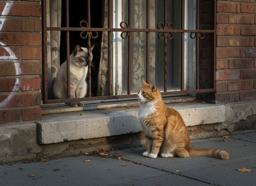 Lucy, die Mischlingskatze, geht durch die Straßen. Sie ist eine Freigängerin und das ist auch gut so. Ihre Freundin Octavia ist eine edle Siamkatze und sie geht nicht raus. Manchmal, wenn Lucy am Fensterkäfig von Octavia Halt macht, tratschen sie ein wenig. Auch heute setzt sich Lucy zu ihrer Freundin. Die Wohnung, in der sie zu Hause ist, liegt an einer belebten Straße. Viele Fußgänger gehen an dem Fenster vorbei. Auch heute Morgen ist es sehr belebt. „Guten Morgen, Octavia, wie geht es dir heute?“ „Ach, Lucy, das neue Futter, das mir meine Dienerin gekauft hat, ist wirklich schrecklich. Ich bekomme Magenschmerzen und dann kotze ich ihr alles vor die…
